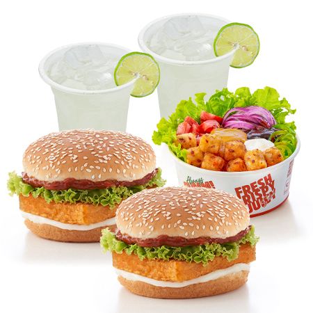 2 Spicy Paneer Burger, 2 Lemon Fizz Cooler, Veg Salad. Note: